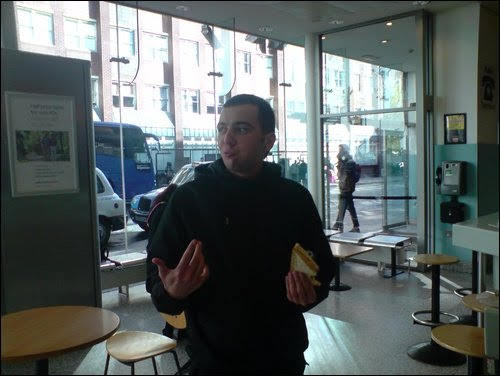 Four hours later touched down at our destination Arrived present and correct and Piccadilly station After a long a tiring journey some of us were famished James appeared swiftly, a sandwich he brandished